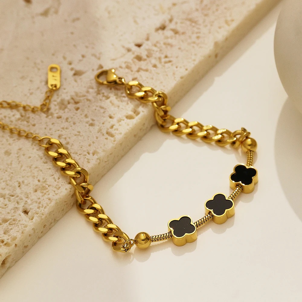 Add a touch of luck and elegance to your look with our Clover Bracelet, featuring charming clover motifs delicately crafted in a sleek metal band.